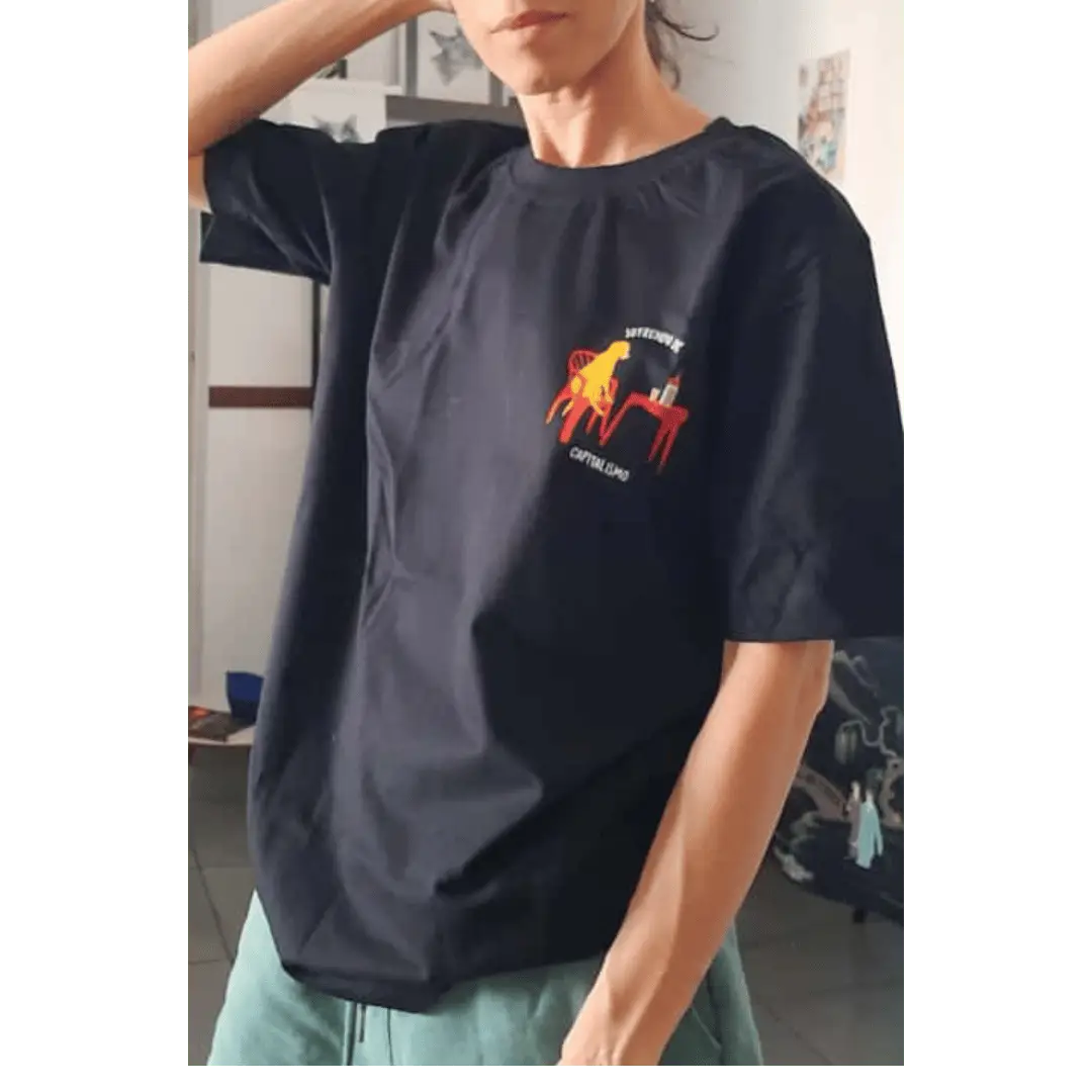 A estampa diz tudo, estamos cansados no bar depois do expediente, uma cadeirinha de plástico, uma cervejinha gelada….sofrendo de capitalismo.